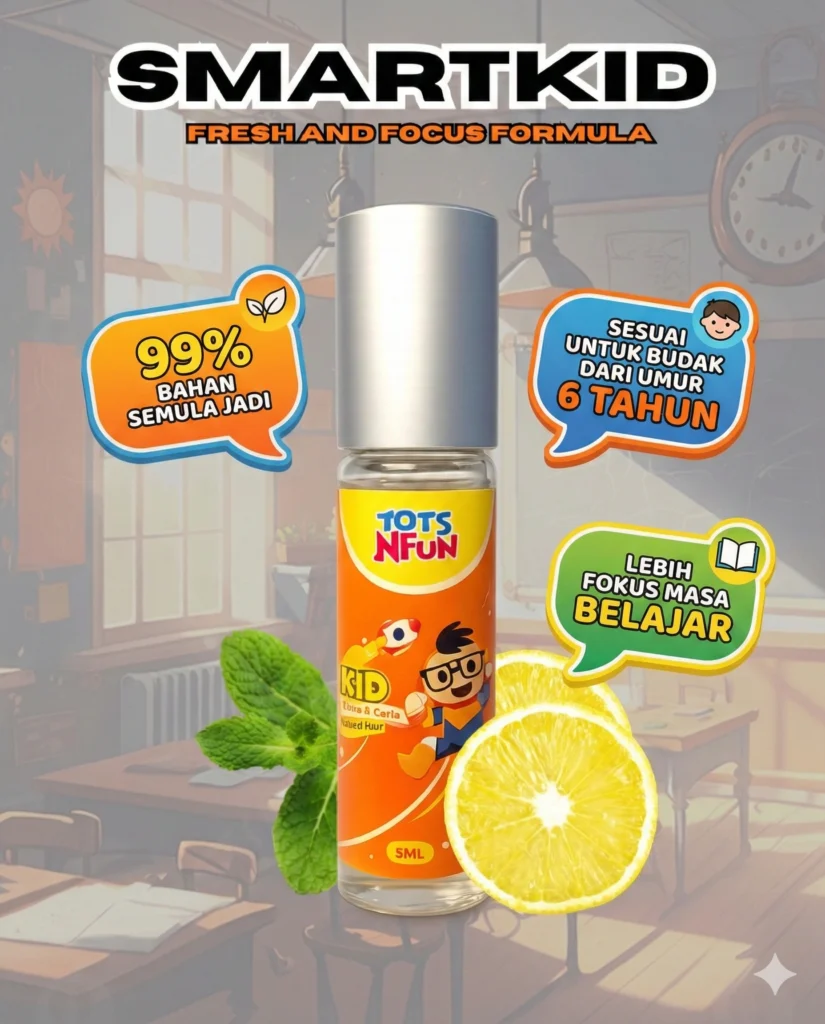 SmartKid ialah minyak aromaterapi roll-on khas untuk kanak-kanak yang diformulasikan bagi membantu meningkatkan fokus belajar, menstabilkan emosi serta melancarkan rutin harian anak. Gabungan aroma semula jadi Rosemary, Peppermint dan Lemon membantu mewujudkan suasana yang lebih tenang, ceria dan bertenaga ketika anak belajar, bermain atau menjalani aktiviti seharian. Sesuai digunakan di rumah, sebelum ke sekolah atau semasa rutin harian keluarga.