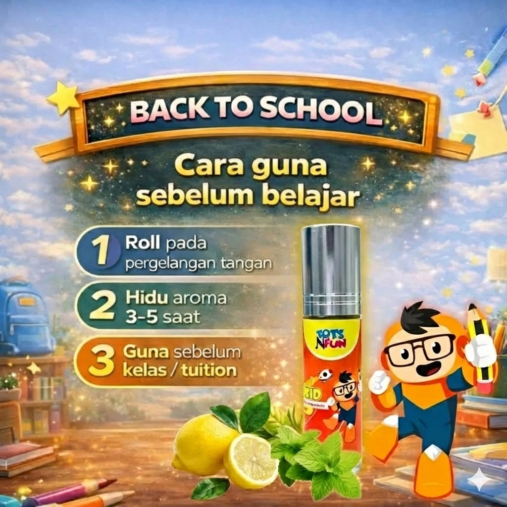 ✅ Membantu anak lebih fokus & tenang sebelum belajar ✅ Menyokong mood positif dan emosi yang lebih stabil ✅ Melancarkan rutin harian seperti pagi, belajar & waktu rehat ✅ Membantu anak kekal aktif bermain tanpa terlalu bergantung pada gadget ✅ Aroma segar & ringan, sesuai untuk kanak-kanak ✅ Mudah digunakan – roll & sapu, sesuai untuk kegunaan harian keluarga